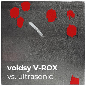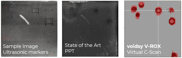 Ein Vergleich zwischen dem kommerziell eingesetzten Ultraschall, der State-of-the-Art Thermographie in Form einer Puls-Phasen-Auswertung (PPT) und dem virtuellen C-Scan zeigt sehr deutlich die Vorteile des voidsy V-ROX Systems auf. Durch die hohe Orts- und Tiefenauflösung des voidsy V-ROX Systems konnten alle Delaminationen korrekt in Position und Größe identifiziert werden. Das hohe Signal-zu-Rausch Verhältnis ermöglichte eine Segmentierung der Defekte.
