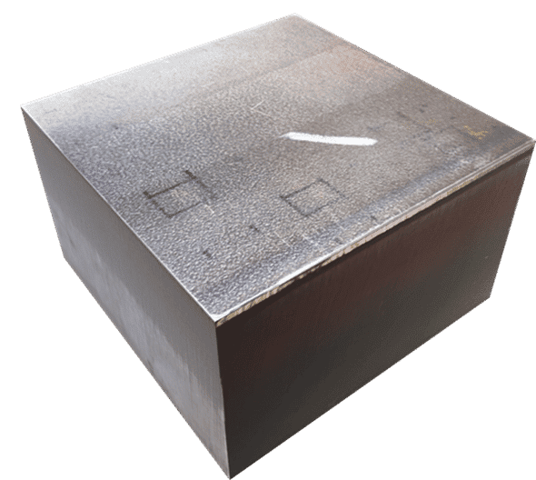 Eine kostengünstige Alternative zur derzeit sehr aufwendigen Ultraschalltechnik bietet die thermische Tomographie auf Basis des mobilen und smarten voidsy 3D V-ROX Sensors. Die gezeigte Stahlprobe hat eine Größe von 100x100x60mm³, wobei die Dicke des Auflagestahls 3 mm betrug. Die mittels Ultraschall gefundenen Defekte wurden per Hand an der Probenoberfläche durch schwarze Rechtecke markiert.